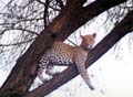 03年9月3日 マサイ・マラ。(78.9KB 691×460) 遠くの木の上にいたこのヒョウを、ドライバーは走る車の中から見つけてくれた。 プロだ! と思わせる、寡黙なドライバーだった。 |
