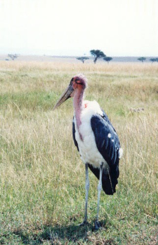 96年6月11日 マサイ・マラ。 (43.5KB 322×500) ハゲコウはイギリス人なんだそうです。 白いシャツに黒いコート、おまけに赤いネクタイなんですって。 |