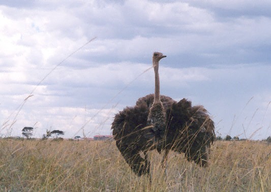 94年3月8日 マサイ・マラ。 (19.3KB 350×245) ダチョウです。こいつはソートーに臆病なヤツでして、なかなか撮れないのですが、今回は本当にラッキー。 まるでバレリーナのようにポーズを決めている。長い脚。 |