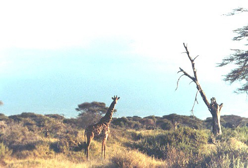 81年8月16日 アンボセリ。 (45.3KB 500×340) 立ち枯れた木のそばに、キリンがぽつんと1頭。 時々こんな風な、文才のある人だったら作品に出来そうな光景にお目にかかる。 |