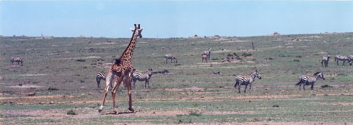 | 94年3月9日 マサイ・マラ。 (24.7KB 500×178) 広いサバンナにキリンとシマウマ。大型ネコ科は確かに美しいし、私自身ぜひ見たいといつも思う。でも、もしかすると、本当のサバンナの美しさは、こういう草食獣が何気なくいる景色かもしれない。 |