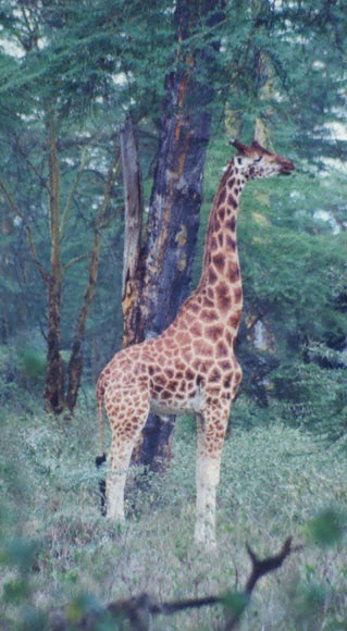 94年3月10日 レイク・ナクル。 (59.8KB 319×580) 夕方のナクル湖畔の林の中、薄闇がおりてくる頃、優雅に菜食行動中のロスチャイルド・キリンに遭遇。 写真を撮り始めると、なぜかピタッと止まって、まるで誰かが大きな彫刻でも置いたよう。 |